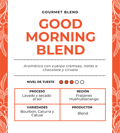 HISTORIA: Nuestra mezcla Good Morning Blend está hecha para animar su día. Un Blend balanceado de dos regiones, Huehuetenango y Fraijanes, hacen de esta una deliciosa taza que presenta un cuerpo cremoso con notas de ciruela y chocolate negro. A cualquier amante del café que busque deleitar sus sentidos con un café de tueste medio, le encantará este favorito de la casa. |