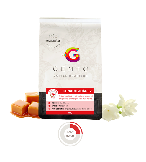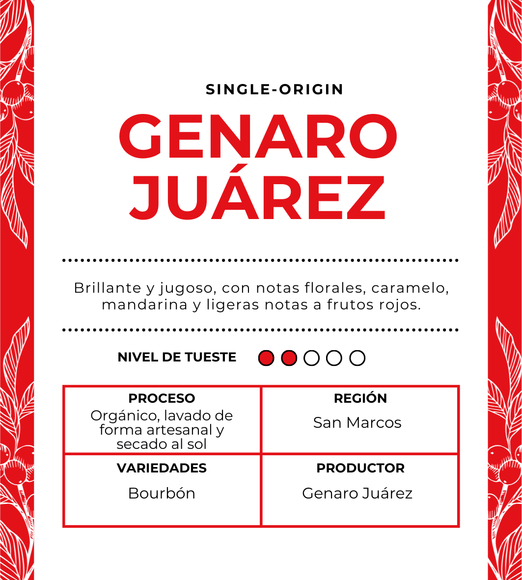 HISTORIA: Este café es producido por un pequeño productor llamado Genaro Juárez, quien ha ganado múltiples premios y reconocimientos en la competencia regional “Lo Mejor de San Marcos”. Don Genaro es un líder en su cooperativa y pone mucho cuidado a su producción de café orgánico totalmente certificado. |