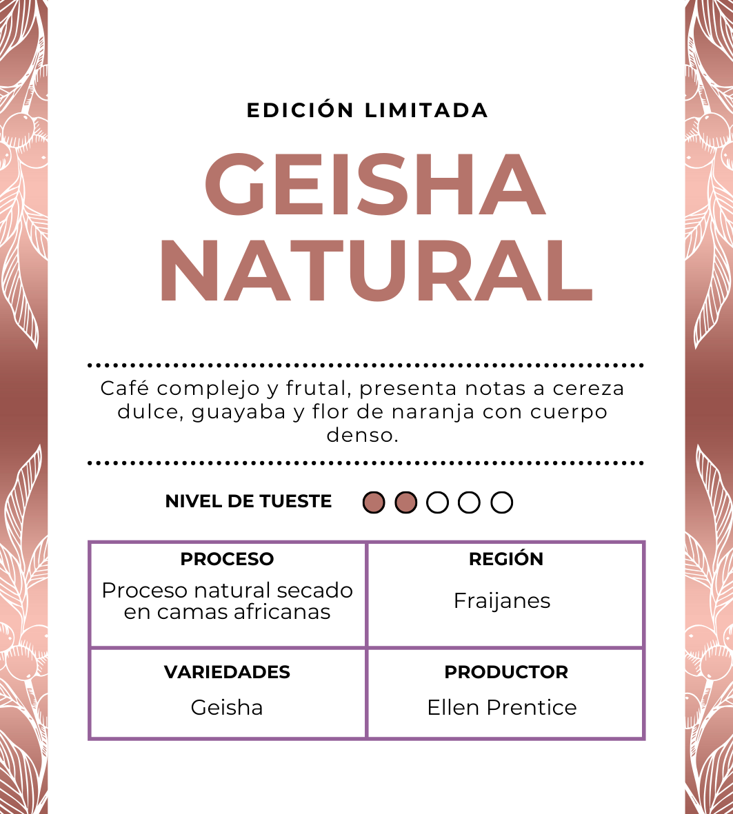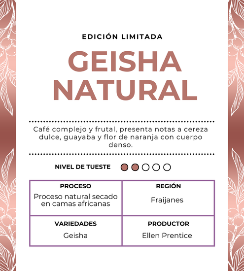 HISTORIA: Nuestro Grand-Cru Series edición limitada está disponible! Incluye variedades exóticas y procesos de nuestra finca premiada por la taza de la excelencia. Estos microlotes fueron seleccionados por su increíble calidad y características para crear una experiencia inolvidable de cafés. Disponibles para pre-ordenar, lo enviamos recién tostado a la puerta de tu casa. Reserva el tuyo hoy. Este extraordinario GEISHA NATURAL eleva el sabor a nuevas cotas. Secado lentamente durante 28 días mediante el proceso natural —donde la cereza del café se seca intacta—, este lote revela una complejidad notable. Descubre vibrantes notas de jazmín, guayaba, cereza dulce y flor de naranja, equilibradas por un cuerpo cremoso, similar al del té negro, que perdura con elegancia. Cada lata contiene 8oz de café recién tostado. |